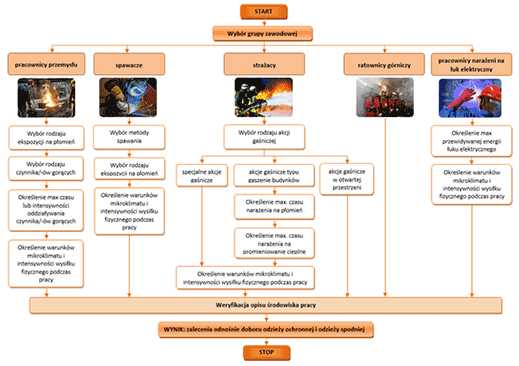 Na bazie wyników uzyskanych z badań laboratoryjnych oraz na podstawie danych literaturowych opracowano poradnik w formie aplikacji komputerowej, dotyczący kompletowania zestawów odzieżowych do prac w mikroklimacie gorącym. Poradnik ten stanowi kompendium wiedzy dla służb BHP odpowiedzialnych za dobór środków ochrony indywidualnej w zakładach pracy, jak również dla producentów odzieży ochronnej, uwzględnia bowiem wszystkie najważniejsze zagadnienia pozwalające na właściwy dobór odzieży ochronnej i odzieży spodniej. Ponadto w ramach zadania opracowano 5-modułowy program komputerowy Safe-Clo, który stanowi proste narzędzie ułatwiające kompletowanie odzieży ochronnej z odzieżą spodnią (bielizną) dla różnych grup zawodowych narażonych podczas pracy na działanie czynników gorących. Program ten dobiera odzież ochronną i odzież spodnią w zależności od rodzaju grupy zawodowej, rodzaju i poziomu zagrożeń oraz ciężkości wykonywanej pracy.