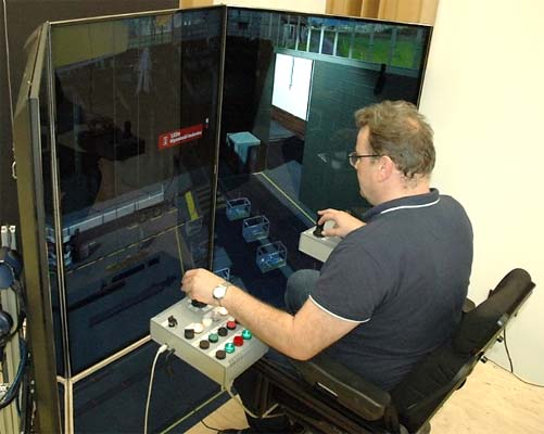 Zadanie 4.G.28. Widok symulatora suwnicy pomostowej sterowanej z poziomu kabiny w wersji przenośnej (a) i stacjonarnej (b)