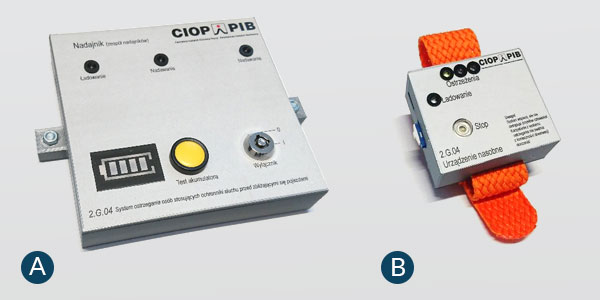 Zadanie 2.G.04. Podstawowe elementy modelu systemu ostrzegania osób stosujących ochronniki słuchu przed zbliżającymi się pojazdami: (A) układ zespołu nadajników, przeznaczony do montowania na pojeździe; (B) urządzenie nasobne, tj. układ odbiornika wraz z układem alarmowania osoby stosującej ochronniki słuchu