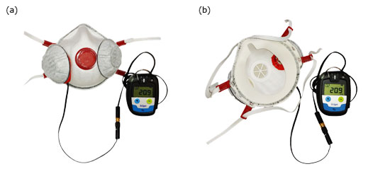 Projekt III.N.12. Półmaska filtrująca wyposażona we wskaźnik tlenu: (a) – widok z przodu, (b) – widok wewnętrznej strony półmaski