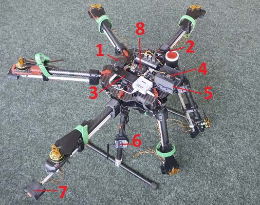 Rysunek 1. Bezzałogowy statek latający (UAV) z złożonymi i rozłożonymi ramionami. 1 – moduł GPS, 2 – czujnik odległości, 3 – komputer pokładowy podłączony do przetwornika zamieniającego sygnał cyfrowy ze złącza HDMI na sygnał analogowy, 4 – moduł telemetrii do transmisji danych pomiarowych, 5 – układy elektroniczne agregujące i przetwarzające dane pomiarowe, 6 – moduł transmisji obrazu z kamery IR lub obrazu z wyjścia komputera pokładowego, 7 – moduł z trzema czujnikami gazów, 8 – autopilot sterujący lotem UAV. Z prawej strony przedstawione jest zdjęcie z testów na poligonie SGSP