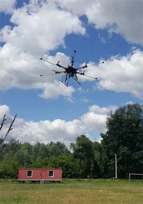 W drugim etapie projektu wybrano komponenty części sprzętowej systemu pomiarowego oraz zbudowano bezzałogowy statek latający (UAV – Unamanned Aerial Vehicle) typu hexacopter, który jest nośnikiem zestawu sensorów wybranych substancji chemicznych (Rysunek 1). Na każdym z sześciu ramion UAV znajduje się głowica z trzema sensorami różnych węglowodorów, gdyż jak wynika z przeprowadzonej analizy danych statystycznych tego typu substancje występują najczęściej w czasie działań ratowniczych prowadzonych przez Państwową Straż Pożarną. Dlatego też tego typu substancje chemiczne zostały wybrane dla demonstratora opracowywanego system, aczkolwiek jego funkcjonowanie może być łatwo dostosowane do innych potrzeb poprzez wymianę głowic pomiarowych. Sensory zamocowane są na teleskopowych rurkach, tak aby mogły być jak najbardziej odsunięty od zaśmigłowego strumienia powietrza. Ponadto, ze względu na stosunkowo długi czas reakcji sensorów, zaproponowane rozwiązanie sprzętowe umożliwia lot UAV w kierunku najwyższego stężenia wybranej substancji chemicznej, a więc w kierunku źródła wycieku. Kierunek wybierany jest na podstawie porównania danych pomiarowych z sensorów zamocowanych na różnych ramionach. Do osiągnięcia celów projektu niezbędne było również zaprojektowanie i oprogramowanie dedykowanych układów elektronicznych umożliwiających przesłanie w czasie rzeczywistym danych pomiarowych drogą bezprzewodową, w celu ich interpretacji i archiwizacji do ewentualnej dalszej oceny i analizy.