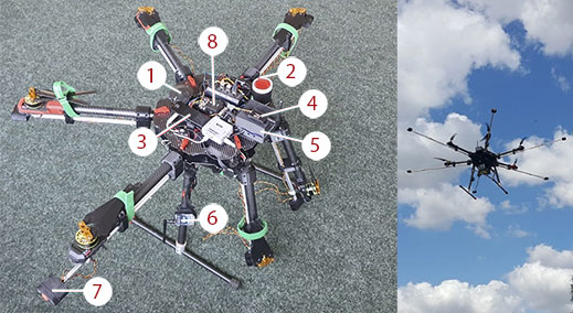 Projekt III.N.05. Bezzałogowy statek latający (UAV) z złożonymi i rozłożonymi ramionami. 1 – moduł GPS, 2 – czujnik odległości, 3 – komputer pokładowy podłączony do przetwornika zamieniającego sygnał cyfrowy ze złącza HDMI na sygnał analogowy, 4 – moduł telemetrii do transmisji danych pomiarowych, 5 – układy elektroniczne agregujące i przetwarzające dane pomiarowe, 6 – moduł transmisji obrazu z kamery IR lub obrazu z wyjścia komputera pokładowego, 7 – moduł z 3 czujnikami gazów, 8 – autopilot sterujący lotem UAV. Z prawej strony – zdjęcie z testów na poligonie SGSP