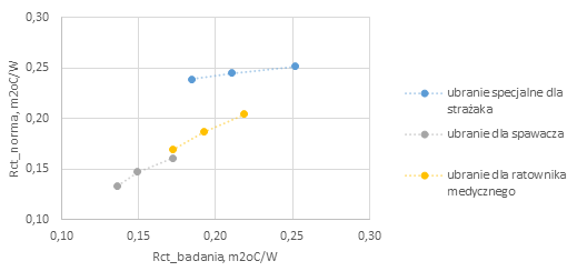 Zadanie 1.G.09. Przykładowa zależność izolacyjności cieplnej (parallel) obliczonej wg normy PN-EN ISO 9920 (Rct_norma) do wartości izolacyjności cieplnej wyznaczonej w badaniach (Rct_badania) dla ubrania dla strażaka, spawacza i ratownika medycznego dla prędkości przepływu powietrza 1,2 – 0,8 – 0,4 m/s (od lewej)