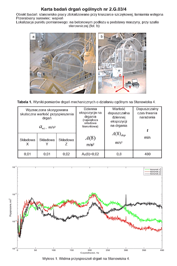 W ramach realizacji zadania przeprowadzono także ocenę ryzyka zawodowego oraz komfortu ze względu na zagrożenia drganiami ogólnymi na stanowiskach pracy związanych z przeróbką surowców mineralnych. Przeprowadzono badania wąskopasmowych charakterystyk częstotliwościowych dla stanowisk pracy związanych z obsługą kruszarek, przesiewaczy, młynów i środków transportu wewnątrzzakładowego. Wyznaczono zakresy częstotliwości, w których występują główne składowe przyspieszeń drgań.