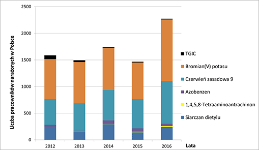 Z informacji zaczerpniętych z Centralnego Rejestru Danych wynika, że w 2016 roku ponad 2270 osób na stanowiskach pracy w Polsce było narażonych na siarczan dietylu, 1,4,5,8-tetraaminoantrachinon (błękit zawiesinowy 1), azobenzen, czerwień zasadową 9, bromian(V) potasu i TGIC, przede wszystkim na wyższych uczelniach, w instytutach naukowych, specjalistycznych laboratoriach oraz stacjach sanitarno-epidemiologicznych. Liczba pracowników narażonych na działanie wytypowanych substancji w zakładach pracy w Polsce w latach 2012-2016 była zmienna. Jedynie w przypadku TGIC zaobserwowano znaczny spadek liczby zgłaszanych narażonych pracowników w roku 2016 w porównaniu z rokiem 2012 (o 84%). Wśród narażonych pracowników objętych rejestracją przeważają kobiety (średnio 68%). Analiza zagrożeń osób zatrudnionych na stanowiskach pracy w Polsce potwierdziła potrzebę oceny narażenia na wytypowane substancje rakotwórcze.