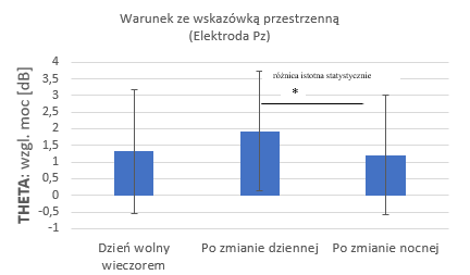Zaobserwowano także istotne różnice dla synchronizacji w paśmie 10–20Hz, w paśmie alfa i theta. U pracowników zmianowych (strażacy) synchronizacja w paśmie 10–20Hz była wyższa w dniu wolnym od pracy (rano) niż po zmianie dobowej, co może być połączone z hamowaniem bodźców zakłócających oraz zwiększeniem poziomu uwagi wzrokowej w przygotowaniu na kolejny bodziec, a większa desynchronizacja w paśmie alfa (ok. 200–800 ms) po bodźcu po zmianie dobowej świadczyć może o pewnym pogorszeniu funkcjonowania w wyniku zmęczenia. W grupie ratowników medycznych zaobserwowano istotnie statystycznie większy wzrost mocy w paśmie theta w warunku ze wskazówką przestrzenną po zmianie dziennej niż po zmianie nocnej, co wskazuje na silniejszą odpowiedź EEG, natomiast większy spadek mocy w paśmie alfa w warunku niezgodnym po zmianie nocnej oznaczać może głębsze przetwarzanie bodźca.