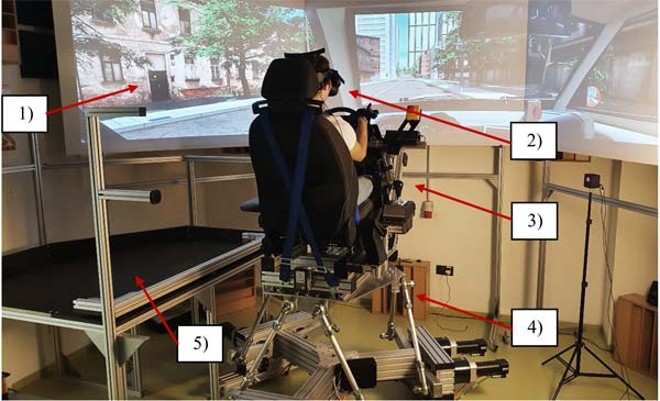 Rys. 1 Stanowisko badawcze do testowania urządzeń umożliwiających osobom z dysfunkcją ruchową kończyny górnej lub dolnej oraz ubytkiem słuchu kierowanie wirtualnym samochodem. 1) obraz wyświetlany na trzech ekranach, 2) obraz wyświetlany z wykorzystaniem gogli rzeczywistości wirtualnej, 3) kokpit kierowcy wraz z oprzyrządowaniem dedykowanym osobom niepełnosprawnym, 4) ruchoma platforma o 6-u stopniach swobody, 5) podest