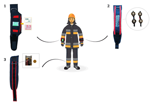 Projekt III.N.16. Schemat przedstawiający opracowane systemy sygnalizacji zagrożeń i ich rozmieszczenie na odzieży ochronnej, gdzie: 1 – SSZ z wyświetlaczem LCD, 2 – SSZ z diodami LED, 3 – SSZ z elementem wibracyjnym