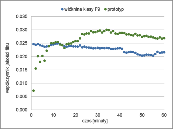 Zadanie 3.G.04. Zdjęcie prototypu struktury filtracyjnej do filtracji spalin z silników Diesla wraz z wykresem porównującym wskaźnik jakości filtra dla prototypu oraz komercyjnie dostępnej włókniny klasy F9