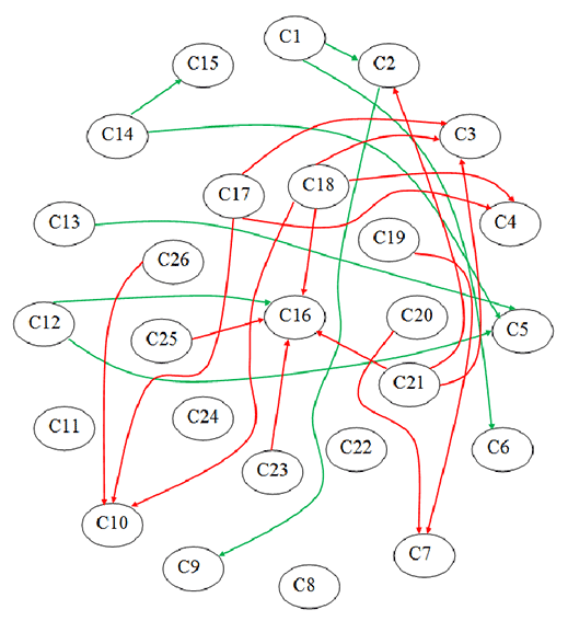 Projekt IV.N.01. Uproszczony model systemu zarządzania BHP w rzeczywistym przedsiębiorstwie opracowany z wykorzystaniem metody rozmytych map kognitywnych. Uproszczenie polega na uwzględnieniu jedynie wpłwywów o najwyższych wartościach sił. Pozytywne wpłwywy oznaczono kolorem zielonym, a negatywne – czerwonym. Symbole obiektów oznaczają odpowiednio: C1 – Przywództwo, C2 – Kształtowanie polityki BHP, C3 – Podział uprawnień i odpowiedzialności, C4 – Partycypacja pracowników, C5 – Przegląd zarządzania, C6 – Komunikacja i informacja, C7 – Szkolenia i zarządzanie kompetencjami, C8 – Wykorzystywanie szans, C9 – Definiowanie i realizacja celów BHP, C10 – Zarządzanie ryzykiem zawodowym, C11 – Gotowość i reagowanie na awarie, C12 – Identyfikacja niezgodności i podejmowanie działań korygujących, C13 – Audyt wewnętrzny, C14 – Monitorowanie