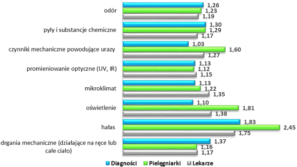 Analiza wyników w kontekście podziału badanej grupy na zajmowane stanowiska pracy wykazała, że drgania mechaniczne (działające na ręce lub całe ciało) oraz pyły i substancje chemiczne są najbardziej uciążliwe dla diagnostów. Hałas, oświetlenie, czynniki mechaniczne powodujące urazy oraz odór są najbardziej uciążliwe dla pielęgniarek. Natomiast mikroklimat oraz promieniowanie optyczne (UV, IR) są najbardziej uciążliwe dla lekarzy.