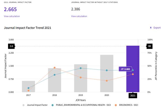 W ramach realizacji zadania zgromadzono i analizowano dane o czasopismach, publikacjach afiliowanych przez polskie instytucje. Korzystając z narzędzi InCites (WoS CC_Clarivate Analytics), SciVal (Scopus_Elsevier), opracowano analizy dotyczące polskich instytucji, których obszar badawczy jest związany z bhp; zaprezentowano m.in. ich współpracę z innymi jednostkami krajowymi i zagranicznymi, bazując na danych publikacyjnych za lata 2019–2022. W realizacji zadania poza sprawdzaniem i rejestrowaniem informacji o publikacji weryfikowano występowanie informacji o artykułach z zakresu bezpiecznego funkcjonowania człowieka w środowisku pracy, gromadzonych w bazach międzynarodowych we wcześniejszych latach, m.in. od 2017 roku. Uzyskane wyniki analiz pozwalają zauważyć przyrost publikacji indeksowanych w bazach i otoczeniu sieciowym, a także wzrost wskaźników bibliometrycznych, czego ilustracją jest kolejny rok wzrostu IF kwartalnika „International Journal of Occupational Safety and Egronomics”, tj.: IF 2021=2,665, IF 2020 = 2,601, IF 2019 = 1,601, IF 2018 = 1,377, IF 2017 = 0,648, IF 2016 = 0,469, czy też liczba indeksowanych publikacji i uzyskiwanych cytowań. Cytowania kwartalnika JOSE wg WoS CC (dane z 2022 r. w trakcie indeksowania w bazie): 2022 = 2223, 2021 = 2155, 2020 = 1603, 2019 = 1125 cytowań.
