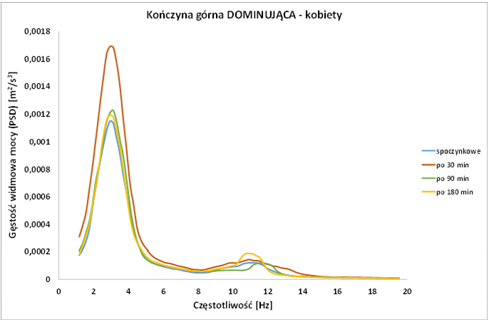 Projekt I.PB.04. Średnie przebiegi funkcji gęstości widmowej mocy sygnału drżenia uzyskany dla dominującej kończyny górnej w kolejnych pomiarach w grupie kobiet (n = 20)