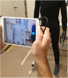 Zadanie 3.SP.04. Przykład wykonywania skanów 3D manekina ubranego w bieliznę (a) oraz przykłady otrzymanych skanów manekina ubranego w specjalistyczną skórę (b) oraz manekna ubranego w zestaw W4 (c)