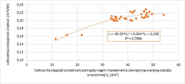 Na tej podstawie wyznaczono wartości wielkości przestrzeni powietrznych, powyżej których nie odnotowano wzrostu izolacyjności cieplnej odzieży. Ze wzrostem całkowitej objętości przestrzeni powietrznych (Vo) do wartości 50 dm3 wzrastała wartość całkowitej izolacyjności cieplnej (It).