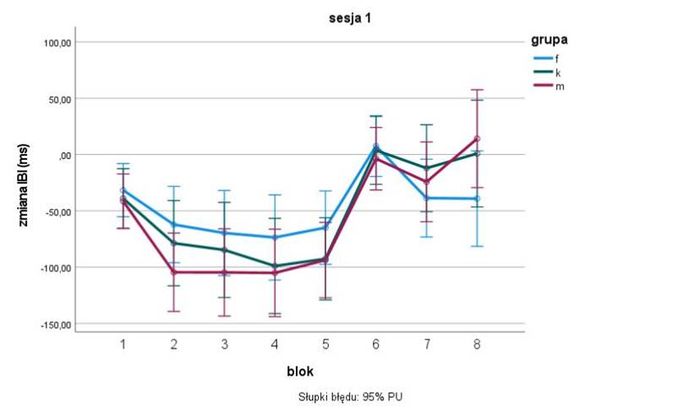 Projekt IV.PB.06. Zmiana odstępów pomiędzy poszczególnymi uderzeniami serca (ang. IBI – interbeat interval) w kolejnych blokach procedury względem baseline dla sesji 1. (bloki: 1 – część kontrola MIST; 2, 3, 4, 5 – część stresowa MIST; 6 – relaks; 7 – ćwiczenie oddechowe; 8 – medytacja; grupy: f – MBSR z fizjologią; k – kontrolna; m – MBSR bez fizjologii)