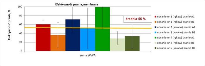 Analiza wyników wykazała, że efektywność czyszczenia odzieży ochronnej dla strażaka była zróżnicowana w zależności od rodzaju substancji zanieczyszczającej, warstwy materiału w odzieży, zastosowanego rodzaju pralnicy oraz obszaru odzieży, z którego pobierano próbki do badań. Średnia efektywność usuwania węglowodorów aromatycznych wynosiła: 91% dla tkaniny zewnętrznej, 55% dla membrany i 72% dla podszewki izolacyjnej. Dla każdego rodzaju materiału najlepsze rezultaty otrzymywano przy wykorzystaniu pralnic specjalistycznych (odpowiednio: tkanina - 99%, membrana - 77%, izolacja - 81%). Mniej korzystnie wypadało zastosowanie pralnic przemysłowych. Różnica między pralnicami specjalistycznymi i przemysłowymi była największa dla membrany i dochodziła do ok. 40%. Najniższe wyniki uzyskiwano dla prania z wykorzystaniem zwykłej pralnicy (tkanina zewnętrzna - 57%, membrana - 33%, podszewka - 33%). Średnia efektywność usuwania ftalanów wynosiła: dla tkaniny zewnętrznej - 79%, dla membrany - 75% i dla podszewki izolacyjnej - 75%. Efektywność usuwania ftalanów z materiałów odzieży wykazywała mniejsze różnice w zależności od rodzaju stosowanego sprzętu piorącego niż dla WWA, a wynosiły one ok. 15-20%.