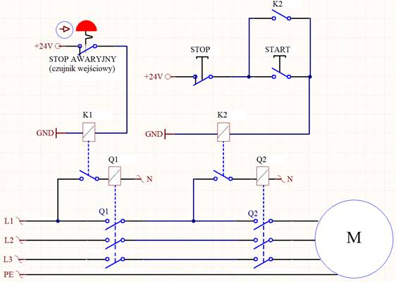 Projekt II.PB.18. Przykład obwodów realizujących operacje funkcjonalne tokarki – a) oraz systemu bezpieczeństwa odpowiedzialnego za zatrzymanie awaryjne – b)