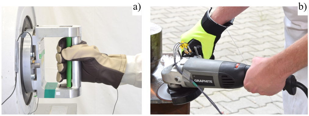 Fot. 1. Przykładowa rękawica antywibracyjna podczas badań: a) na laboratoryjnym stanowisku pomiarowym b) w warunkach rzeczywistych.
