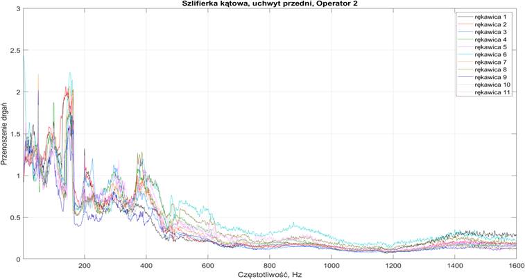 Wykres 1. Przykładowe uśrednione wąskopasmowe charakterystyki przenoszenia drgań przez 11 testowanych rękawic podczas pracy Operatora 2 szlifierką kątową (uchwyt przedni)