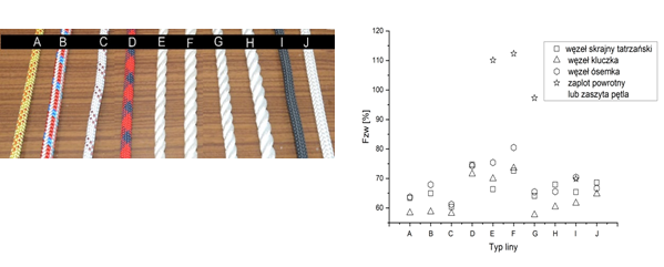 Zadanie 3.SP.03. Liny włókiennicze poddane badaniom i względne wartości siły zrywającej linę zakończoną pętlą z zawiązanym węzłem