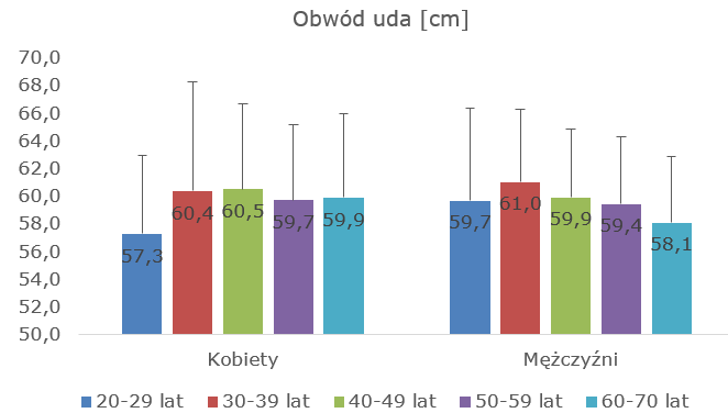 Projekt I.PB.09. Średnie wartości obwodu uda u badanych osób z podziałem na wiek i płeć