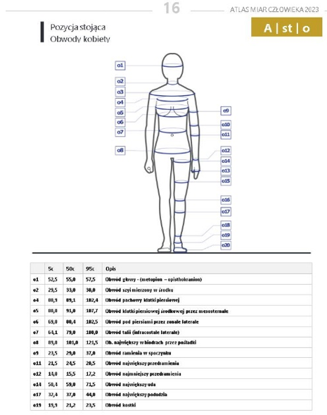 - dane antropometryczne (wysokości, szerokości, głębokości, obwody, całego ciała człowieka oraz szczegółowo głowy, ręki i stopy),
