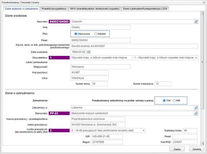 Zadanie 4.SP.16. Formularz aplikacji webowej SterWeb przeznaczony do wprowadzania informacji o poszkodowanym w wypadku przy pracy