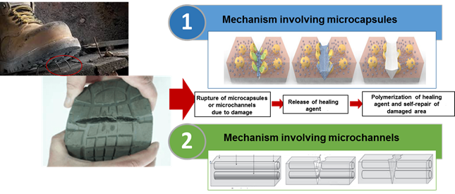 The applied autonomous self-healing mechanisms (ASMs) have the capacity of immediate material regeneration without external intervention. The first ASM involves a microencapsulated monomer released in the case of damage to fill the resulting defect in the sole. The other ASM involves the implementation of a network of channels supplying the monomer to the damaged area.