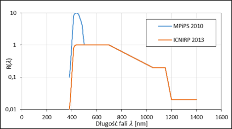 Celem głównym zadania była weryfikacja metod pomiarowych i kryteriów oceny zagrożenia promieniowaniem widzialnym (VIS) i podczerwonym (IR) wynikających z zaleceń Międzynarodowej Komisji ds. Ochrony przed Promieniowaniem Niejonizującym (ICNIRP) opublikowanych w dokumencie Guidelines on limits of exposure to incoherent visible and infrared radiation z 2013 r. Zaproponowane kryteria porównano z obecnie obowiązującymi przepisami zawartymi w dyrektywie 2006/25/WE i przepisach krajowych. Ustalono, że istnieją znaczące różnice w sposobie oceny zagrożenia termicznego i fotochemicznego uszkodzenia siatkówki oraz termicznego uszkodzenia rogówki i soczewki oka. Różnice te obejmują m.in. zmiany krzywych skuteczności (wykres poniżej) oraz zmiany sposobu wyznaczania wartości Maksymalnych Dopuszczalnych Ekspozycji (MDE) dla różnych zakresów czasu ekspozycji i wymiarów kątowych źródła.