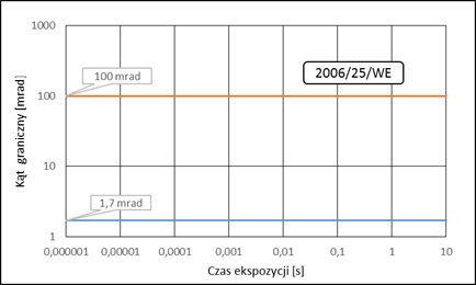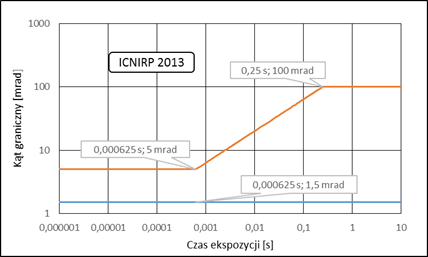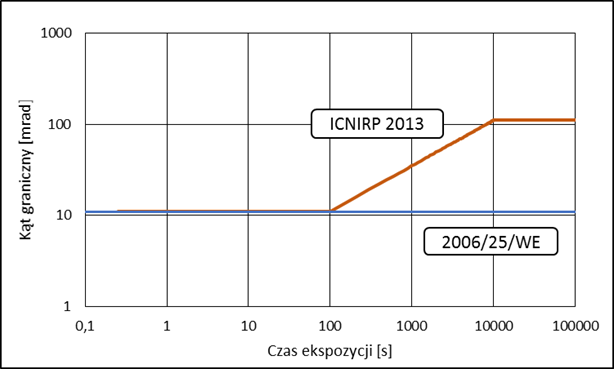 W zakresie zagrożenia termicznego siatkówki oka przy silnym bodźcu świetlnym (380 ÷ 1400 nm) ICNIRP proponuje wprowadzenie nowych wartości kątów granicznych określających małe i duże źródła. Kąt graniczny dla dużych źródeł jest zależny od czasu ekspozycji. Porównanie wartości kątów granicznych wynikających z aktualnych i proponowanych zaleceń przedstawiono na rysunku. W pozostałych zakresach kryteria dotyczące kąta odbioru detektora nie wymagają zmian w normie PN-EN 14255-2:2010.