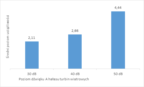 Badanie ankietowe (w warunkach laboratoryjnych) dotyczące oceny uciążliwości odtwarzanych w warunkach laboratoryjnych hałasów turbin wiatrowych przeprowadzono w grupie 40 osób. Osoby badane spośród odtwarzanych hałasów turbin wiatrowych wybrały i oceniły jako najbardziej uciążliwy hałas turbin wiatrowych o poziomie dźwięku A wynoszącym 50 dB (wykres poniżej). Hałas ten osoby badane uznały w stopniu istotnym statystycznie za bardziej uciążliwy niż hałasy turbin wiatrowych o poziomach dźwięku A wynoszących odpowiednio 30 dB i 40 dB.