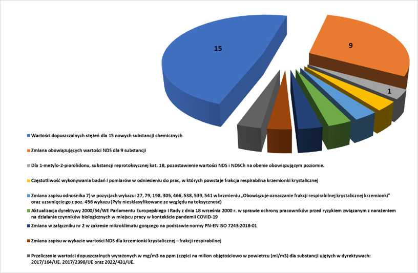 - zmianę obowiązujących wartości NDS/NDSCh dla 9 substancji chemicznych, w tym 5 substancji rakotwórczych o różnej kategorii [akrylonitryl, pyły drewna, związki chromu(VI), benzen; nikiel i jego związki] oraz 2 substancje reprotoksyczne kat. 1B [ftalan dibutylu; ftalan bis(2-etyloheksylu)];