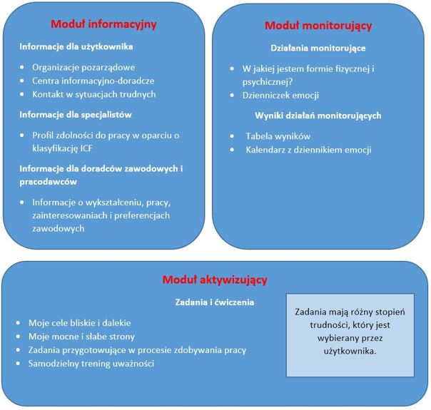 - informacyjnego – zawierającego informacje dla użytkownika (dane teleadresowe z hiperłączami do stron organizacji pozarządowych, centrów informacyjno-doradczych oraz kontakt telefoniczny w sytuacjach trudnych), a także dla specjalistów oraz doradców zawodowych i pracodawców („Profil zdolności do pracy w oparciu o klasyfikację ICF”, informacje o wykształceniu, doświadczeniach, zainteresowaniach i preferencjach zawodowych),