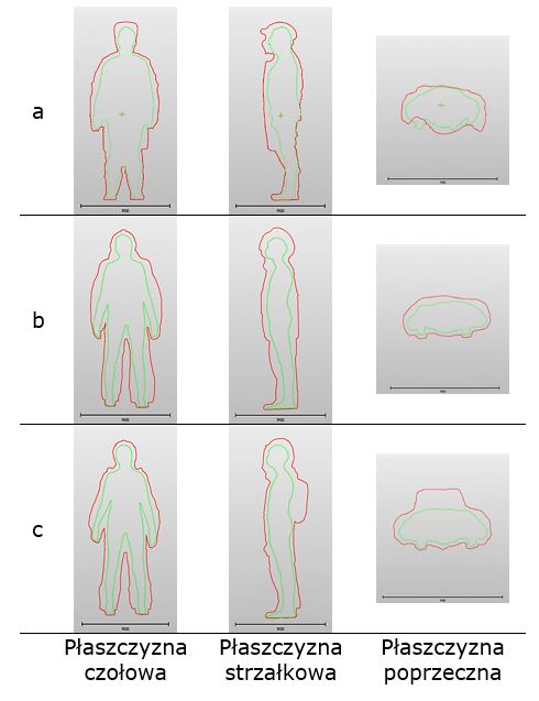 Projekt I.PB.10. Widok naddatków wymiarowych wynikających ze stosowania kompletnego wyposażenia ochronnego: spawacza (a), strażaka (b) i ratownika górniczego (c) w 3 płaszczyznach: czołowej (naddatki do wysokości i do szerokości), strzałkowej (naddatki do głębokości), poprzecznej (naddatki do maksymalnego obwodu wyznaczane w miejscu maksymalnego obwodu dla szerokości barkowej)