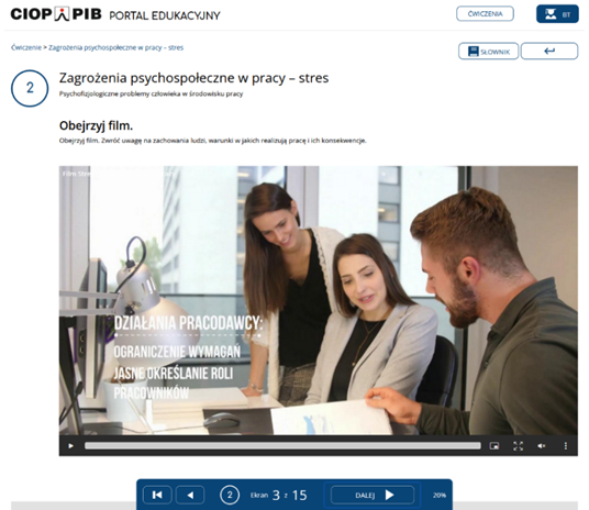 - 18 interaktywnych ćwiczeń komputerowych (dostępnych pod adresem: pcwedu.ciop.pl z serwera CIOP-PIB po uprzednim otrzymaniu hasła dostępu), które mogą być stosowane w edukacji zdalnej i stacjonarnej,
