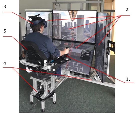 Zadanie 4.SP.01. Widok symulatora wirtualnego żurawia: 1. Jeden z dwóch dżojstików do sterowania wirtualnym żurawiem; 2. Ekrany do wyświetlania obrazu z środowiska wirtualnego; 3. Gogle VR; 4. Aluminiowa konstrukcja symulatora żurawia; 5. Siedzisko operatora