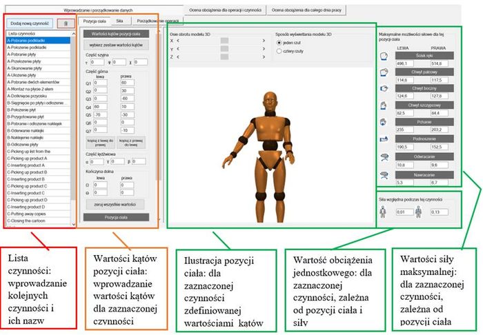 Opracowane procedury oceny ryzyka oraz prezentacji rekomendacji dla interwencji ergonomicznej przeprowadzono na podstawie systematycznego przeglądu publikacji o zasięgu międzynarodowym oraz wiedzy eksperckiej wykonawców zadania. Procedury odnoszą się do wprowadzania danych, obliczeń wskaźników obciążenia oraz rekomendacji do zmian na stanowisku pracy. Do przeprowadzenia oceny konieczne jest wprowadzenie danych dotyczących każdej czynności wykonywanej podczas pracy, definiujących pozycję ciała pracownika, wywieraną przez niego siłę i sekwencje czasu wykonywania poszczególnych czynności. Na podstawie tych danych obliczany jest wskaźnik obciążenia określonego obszaru ciała oraz wskaźniki pośrednie charakteryzujące czynności i operacja, składające się na dzień pracy, takie jak: obciążenie względne każdej z czynności, liczba wszystkich czynności, zmienne charakteryzujące liczbę takich samych czynności występujących podczas pracy, obciążenie średnie i czas trwania poszczególnych operacji. Wartości tego wskaźnika, jak i wartości wskaźników pośrednich stanowią podstawę do rekomendacji dla interwencji ergonomicznej.