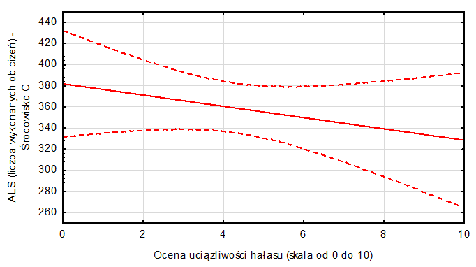Zadanie 1.SP.05. Zależność między liczbą wykonanych obliczeń w teście ALS a subiektywnie odczuwaną uciążliwością (linią przerywaną oznaczono granice ufności 95%)