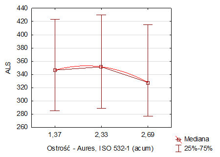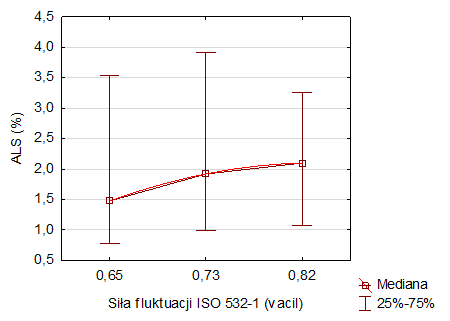 Zadanie 1.SP.05. Zależności dawka-odpowiedź dla testu wydajności pracy ALS w odniesieniu do parametrów psychoakustycznych siły fluktuacji (po lewej) i ostrości (po prawej)