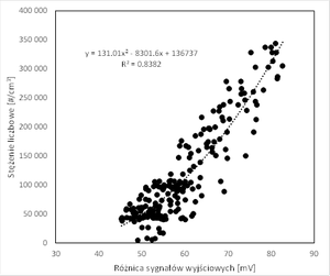 Badania potwierdziły, że detektor aerozoli nanoobiektów jest urządzeniem wykrywającym nanoobiekty oraz ich agregaty i aglomeraty (NOAA) w powietrzu i mierzącym ich stężenie (po odpowiedniej kalibracji) w zakresie 10 000 – 400 000 cząstek/cm3. Na podstawie pomiarów oraz dolnych granic zakresów pomiarowych urządzeń (miernika referencyjnego MINI-WRAS to 3000 cząstek/cm3, a prototypu detektora to 45 mV) sporządzono zależność stężenia liczbowego cząstek (MINI-WRAS) od różnicy sygnałów wyjściowych prototypu detektora (rysunek poniżej). Korelacja w tym przypadku jest silna. Krzywa najlepszego dopasowania jest krzywą drugiego stopnia i została wybrana, ze względu na lepsze odwzorowanie zarówno bardzo niskich, jak i bardzo wysokich stężeń liczbowych. Charakteryzowała się również większym współczynnikiem korelacji niż krzywa liniowa.