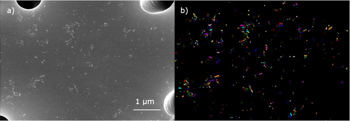 Prace prowadzone w 3. etapie zadania obejmowały opracowanie programu do półautomatycznej analizy obrazu do wyznaczania parametrów charakterystycznych nanoobiektów. Metoda pozwala na binaryzację w sposób półautomatyczny obrazów SEM w celu odseparowania zdeponowanych cząstek od podłoża, co umożliwia szybsze i bardziej precyzyjne zliczanie nanoobiektów. Dalsza analiza ilościowa nanoobiektów umożliwia wyznaczenie charakterystycznych parametrów z większą liczebnością i dokładnością w porównaniu do ręcznej analizy. Na podstawie wyznaczonych wielkości udziału powierzchniowego oszacowano stężenie liczbowe nanoobiektów. Dodatkowo wykorzystano uczenie maszynowe do automatycznego grupowania cząstek pod względem morfologicznym. Sprawdzono zarówno metody uczenia nienadzorowanego, jak i nadzorowanego. Z metod nienadzorowanych wybrano do zastosowania algorytm k-średnich (KMeans) oraz klastrowanie spektralne (Spectral Clustering), natomiast z metod nadzorowanych wybrano do zweryfikowania m.in.: metodę wektorów nośnych (Support Vector Machines), drzewa klasyfikacyjne (Decision Tree Classifier) oraz głęboką sieć neuronową.