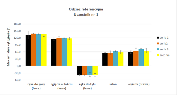 Zadanie 3.SP.01. Porównanie wartości maksymalnych kątów zgięcia (w stopniach) uzyskanych w trakcie serii 1., 2. i 3. badań w odzieży referencyjnej dla różnych rodzajów wykonywanych ruchów z wykorzystaniem systemu do przechwytywania ruchów ciała motion capture