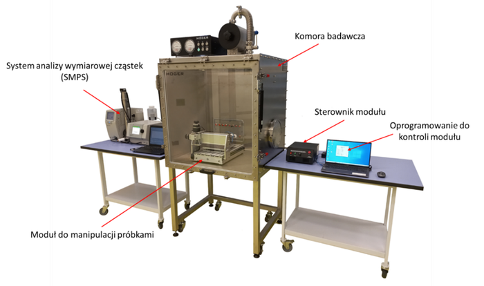 Stanowisko badawcze składa się z 2 głównych elementów. Pierwszym z nich jest komora badawcza umożliwiająca badanie emisji nanoobiektów w atmosferze, w której stężenie cząstek tła bliskie jest 0/cm3 (dla cząstek < 1µm). W komorze umieszczany jest moduł umożliwiający manipulowanie badanymi próbkami. Aby zbadać proces uwalniania się nanoobiektów, produkty mogą być podawane różnym działaniom, np. przedmuchiwaniu, tarciu, uderzaniu. Procesy te mają odzwierciedlać rzeczywiste sytuacje, które mogą występować podczas użytkowania badanych produktów. Badanie realizowane jest w oparciu o opracowaną procedurę badawczą, która zakłada analizę uwalnianych cząstek w zakresie od 32,8 do 749,9 nm z wykorzystaniem systemu analizy wymiarowej cząstek SMPS (Scanning Mobility Particle Sizer, TSI Incorporated, USA). Urządzenie umożliwia m.in. określenie stężenia liczbowego oraz rozkładu wymiarowego cząstek, które potencjalnie mogą być uwalniane podczas badania. Dodatkowo, procedura zakłada możliwość wykonania analizy uwalnianych cząstek za pomocą mikroskopu elektronowego SEM.