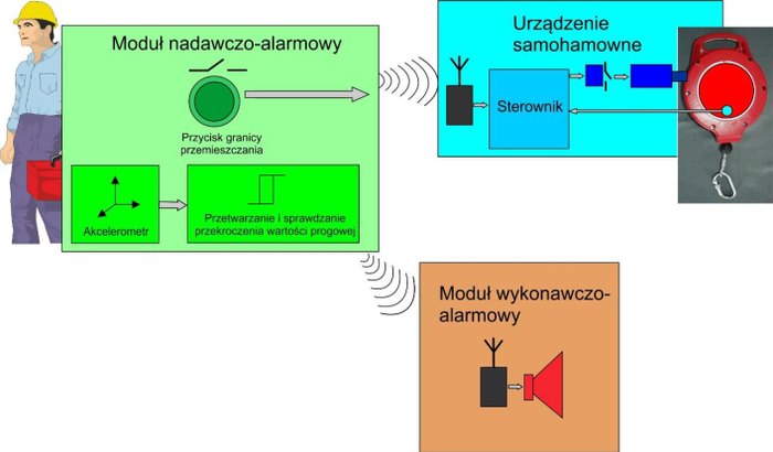 - nadawczo-alarmowego – bezpośrednio związanego z człowiekiem, zawierającego przetworniki przyspieszenia, programowalny procesor sterujący oraz przycisk osiągnięcia granicy przemieszczania,