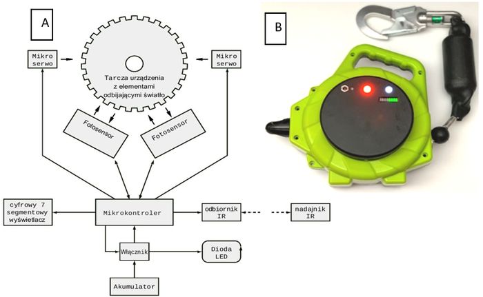 Główne podzespoły opracowanego i zintegrowanego z urządzeniem samohamownym systemu elektronicznego to programowalny mikrokontroler, serwomechanizmy z wysuwanymi trzpieniami oraz fotosensory, dzięki którym możliwe jest dekodowanie zwijania i rozwijania liny z bębna urządzenia. Blokowanie wysunięcia linki z wykorzystaniem tego systemu następuje wskutek uruchomienia 2 serwomechanizmów z trzpieniami, które aktywują wbudowane, oryginalne zapadki urządzenia samohamownego. Uproszczony schemat blokowy systemu oraz opracowany prototyp przedstawiano na poniższych rysunkach.