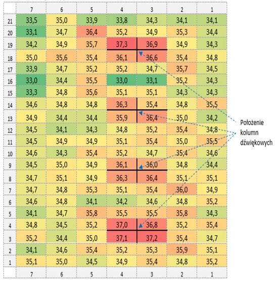 Zadanie 2.SP.05. Wyniki pomiaru w rozpatrywanym pomieszczeniu poziomu dźwięku A sygnału generowanego przez prototyp systemu maskującego dźwięki mowy