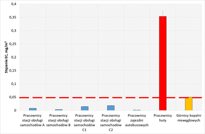Analiza wyników oznaczonych stężeń węgla elementarnego na stanowiskach pracy zlokalizowanych na powierzchni, tj. w warsztatach samochodowych, zajezdni autobusów oraz w hucie, gdzie pracują spalinowe wózki widłowe, wykazała, że największe stężenia węgla elementarnego oznaczono na stanowiskach pracy starych wózków widłowych w hucie. Oznaczone stężenia EC na tych stanowisku pracy wynosiły odpowiednio 0,35 mg/m3 i 0,079 mg/m3, co stanowi odpowiednio 7-krotne i 1,6-krotne przekroczenie wartości NDS. Na pozostałych badanych stanowiskach pracy – w warsztatach samochodowych i zajezdni autobusowej – oznaczone stężenia były w zakresie 0,1–0,5 NDS lub poniżej wartości 0,1 NDS.