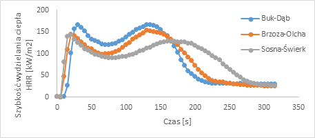 Wyniki uzyskane w ramach 3. etapu wskazują, że w przypadku parametrów charakteryzujących palność występują różnice pomiędzy pyłami drewna twardego i miękkiego. Dodatkowo mieszanina drewna twardego i miękkiego (brzoza ‒ olcha) wskazuje korelację pomiędzy wartościami uzyskiwanych parametrów. W przypadku badań na kalorymetrze stożkowym wartości te uśredniają się, natomiast synergia wpływów pyłu drewna miękkiego i twardego spowodowała, że dla badań procesów dymotwórczych mieszanka pyłów uzyskała najwyższe wartości maksymalnej wartości gęstości optycznej dymu (MSOD) oraz skumulowanej wartości gęstości zadymienia w pierwszych czterech minutach testu (VOF4). Również wykres szybkości wydzielania ciepła w czasie mieszaniny brzoza ‒ olcha pokazuje połączenie zachowania się pyłów drewna twardego i miękkiego podczas pierwszej fazy pożaru.